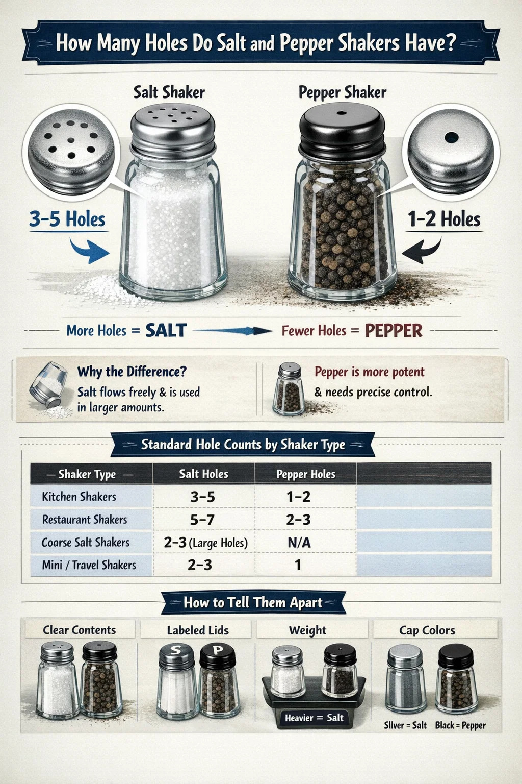 Wenn Sie importierte Küchengewürzbehälter aus Glas oder antike Shaker-Sets kaufen, lohnt es sich, das Etikett zu überprüfen oder jeden Shaker zu testen, bevor Sie ihn auf den Tisch stellen. Insbesondere einige britische Vintage-Sets folgen der umgekehrten Konvention ohne visuelle Anzeige außer der Anzahl der Löcher.