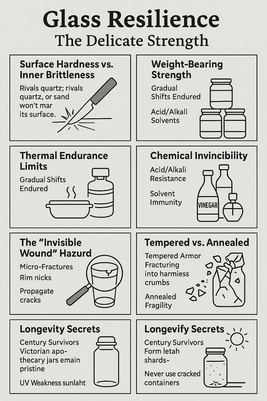 Geglühte Zerbrechlichkeit: Standardgläser bilden tödliche Scherben – verwenden Sie niemals zerbrochene Behälter.