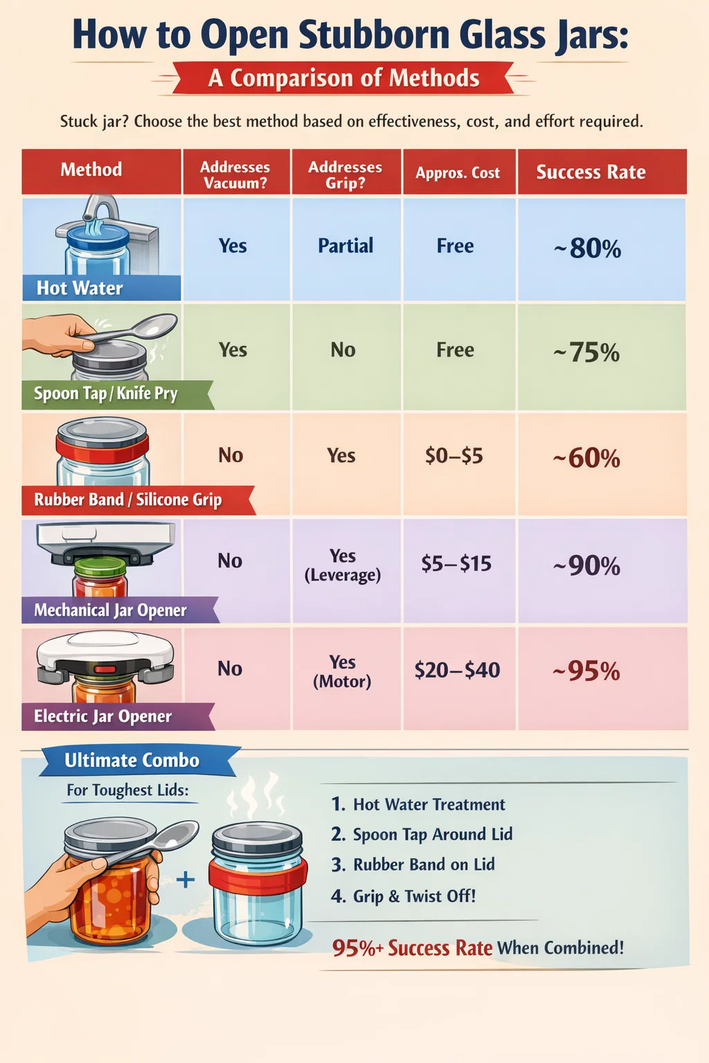 Diese fünfstufige Sequenz beseitigt alle möglichen Ursachen für Widerstand: Das heiße Wasser dehnt das Metall aus und schwächt das Vakuum, das Klopfen zerstört die Dichtung und das Gummiband maximiert Ihren Drehgriff. In der Praxis, Dieser kombinierte Ansatz öffnet über 95 % der festsitzenden Vorratsgläser aus Glas ohne weitere Werkzeuge, die über das hinausgehen, was sich bereits in einer Standard-Küchenschublade befindet.