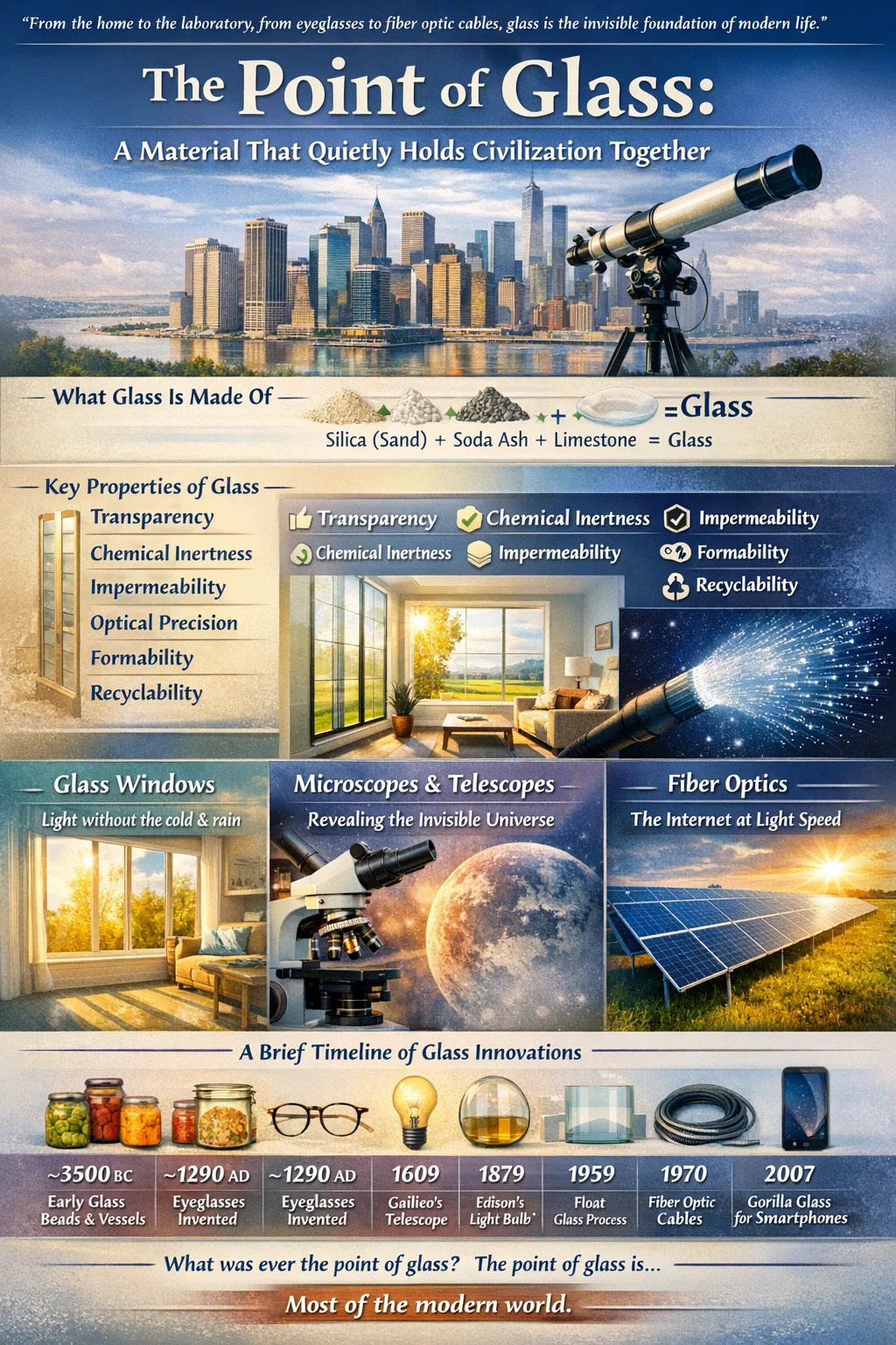 Glas ermöglichte es den Menschen, Licht in Gebäuden zu haben, ohne Wind und Regen hereinzulassen. Dadurch konnten Wissenschaftler Dinge sehen, die für das bloße Auge zu klein waren. Es transportierte Informationen als Licht über Kontinente hinweg. Es konservierte Lebensmittel, schützte Medikamente und baute Teleskope, die das Verständnis der Menschheit vom Universum veränderten. Ohne Glas hätten die wissenschaftliche Revolution, die industrielle Revolution und das moderne Kommunikationszeitalter völlig anders ausgesehen – oder wären überhaupt nicht passiert.